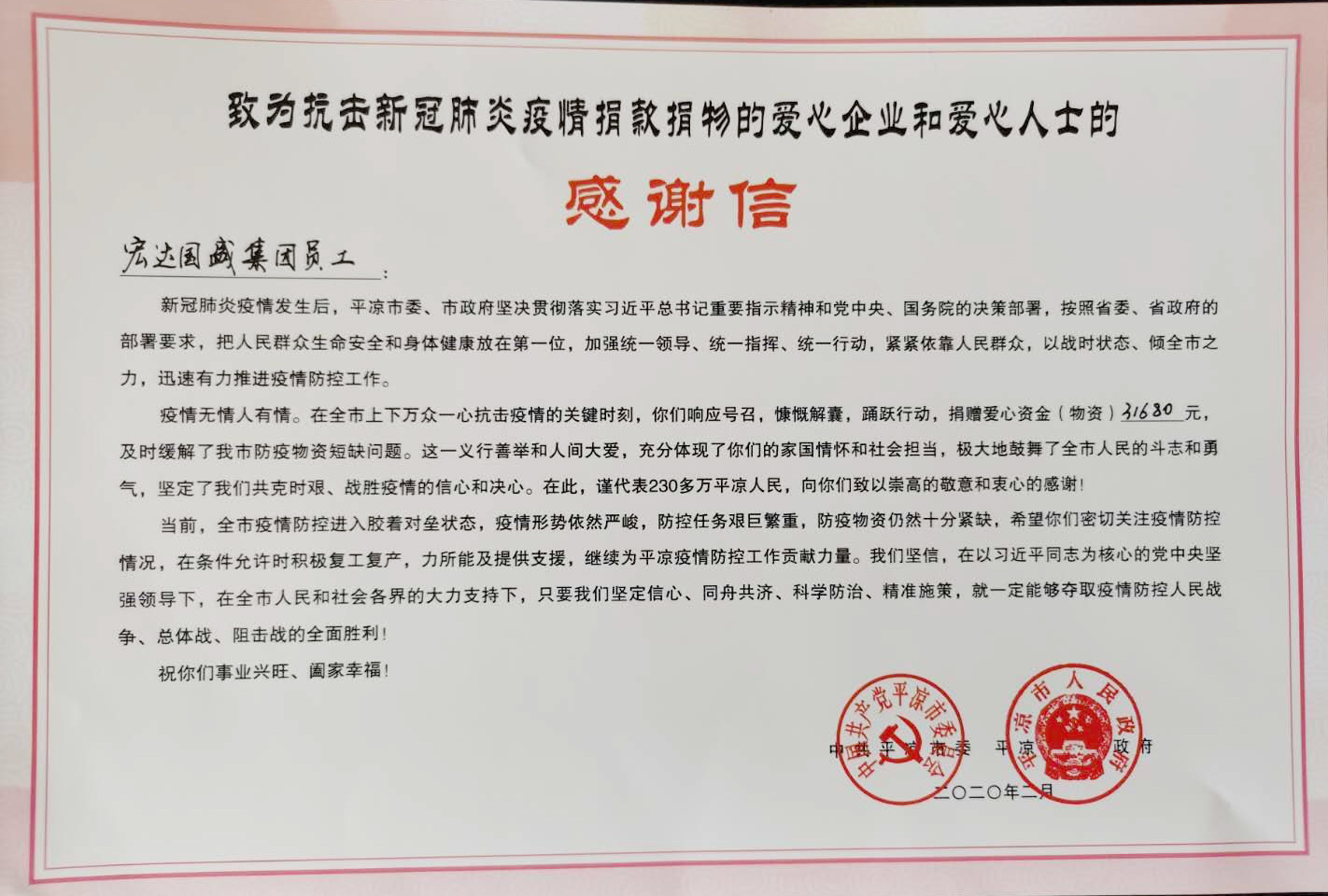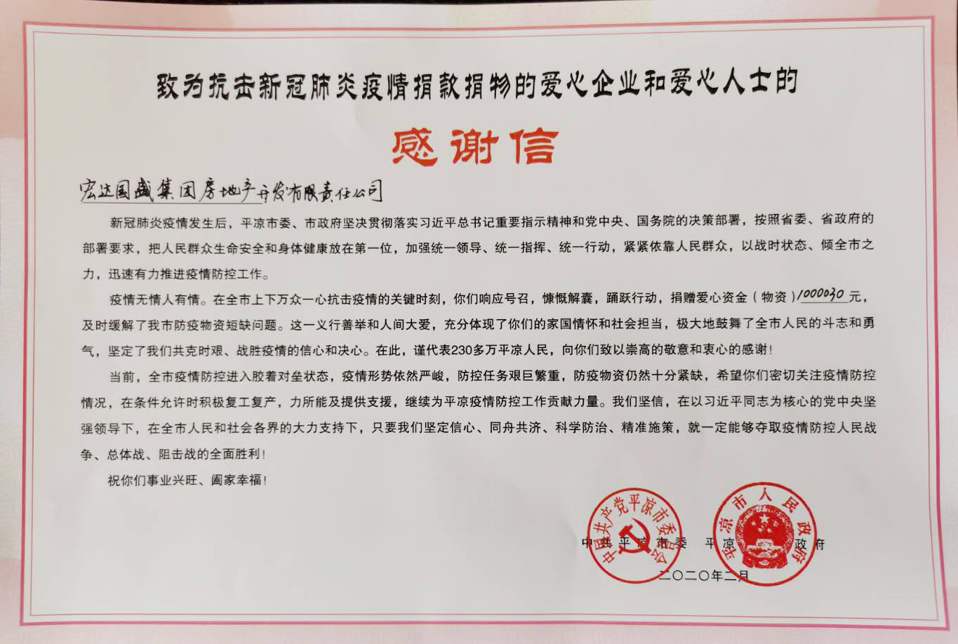 平?jīng)鍪惺形⑹姓潞赀_(dá)國盛集團(tuán)感謝信